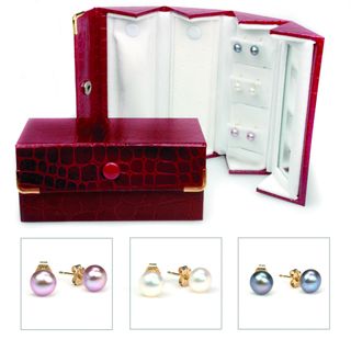 | beautiful 3pc freshwater pearl set in travel case features three pairs of 6-6.5mm button pearls, white, pastel and soft black set on 14k gold posts with 14k butterflies. The travel case has a mirror and can hold earrings and rings |